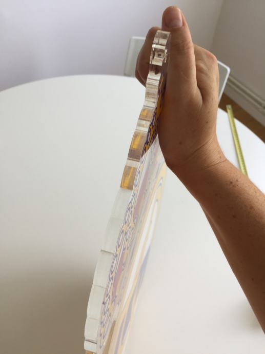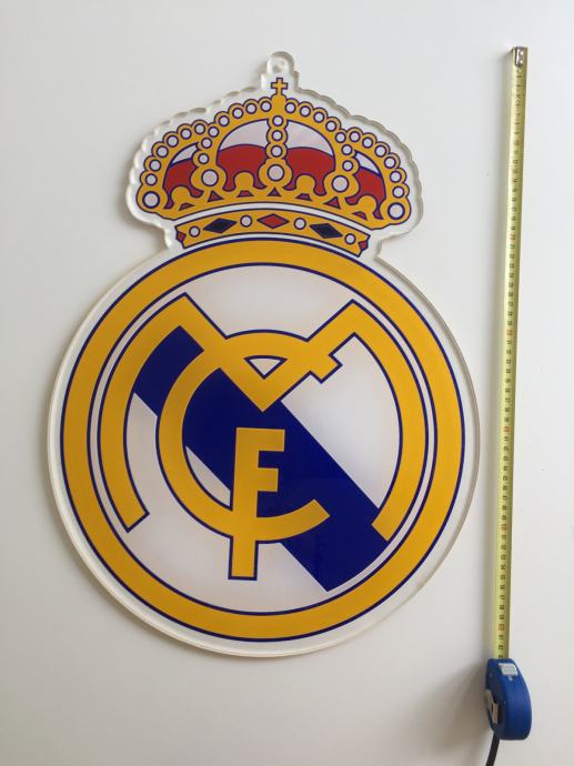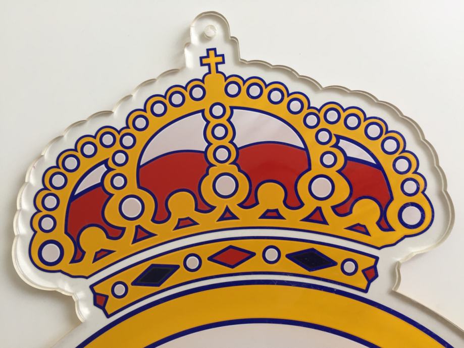 Ručni rad, unikat, grb nogometnog kluba Real Madrid napravljen od 1 cm debelog prozirnog plexiglasa i folija u pripadajućim bojama, s rupicom za vješanje na zid