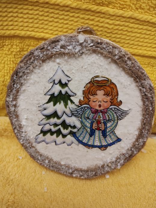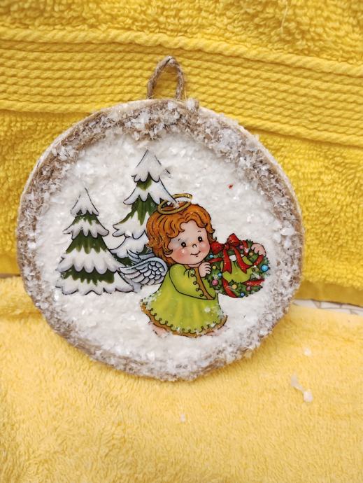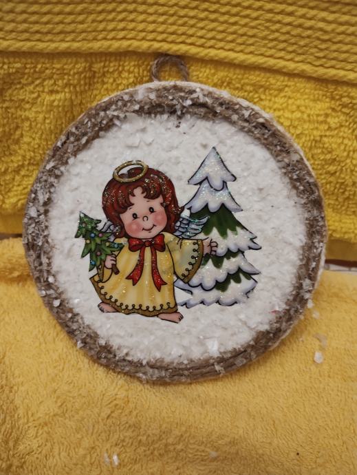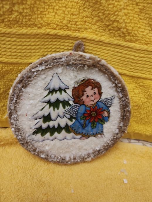 Slikica se sastoji podloga pluto ukrasna slikica a anđela obrubljeni sa špagom posipano sa umjetnim snijegom