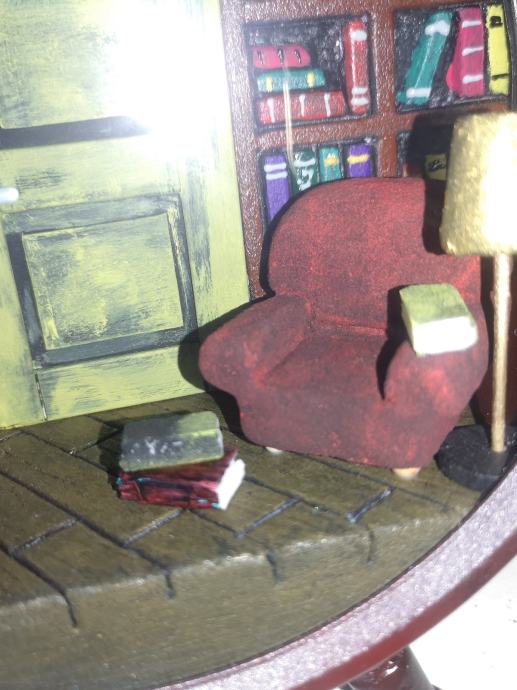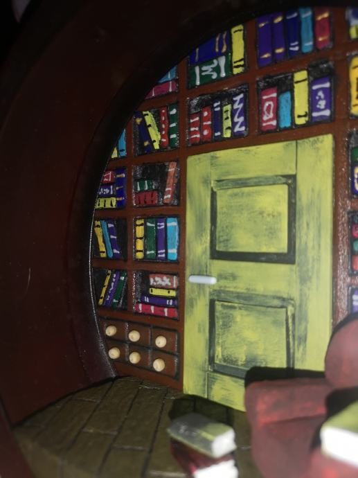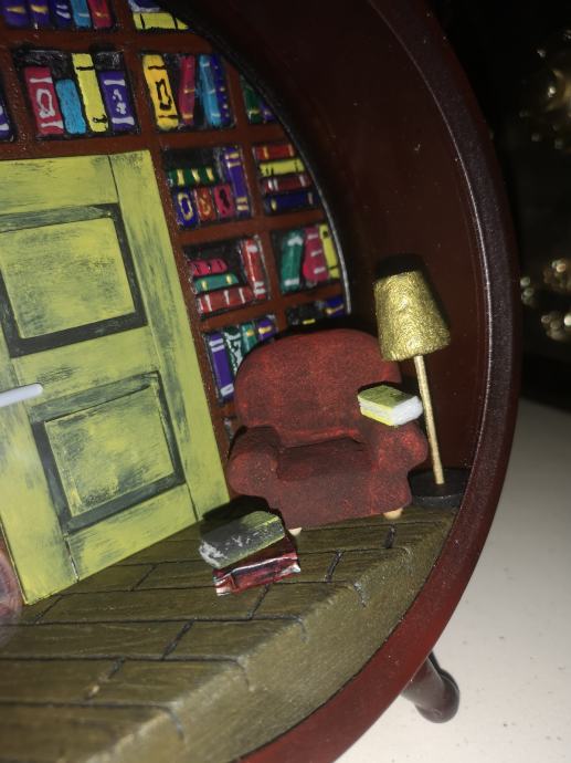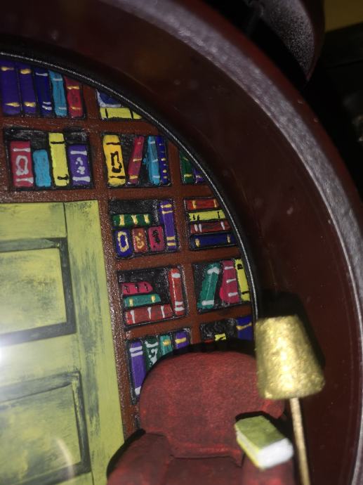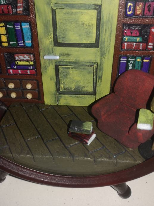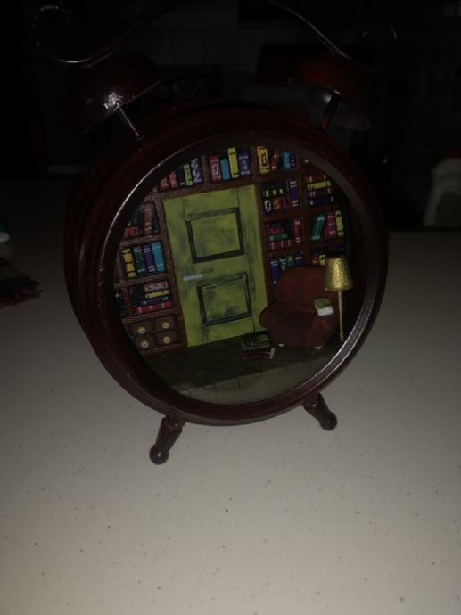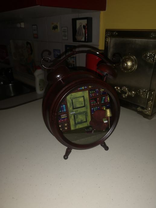 Diorama biblioteke u stolnom satu. Fotelja, police, minijatura, knjige, podna lampa, drvena vrata. Ručni rad, unikat, metalni sat, dimenzije v 25 x š 20 cm. Ne šaljem pouzećem