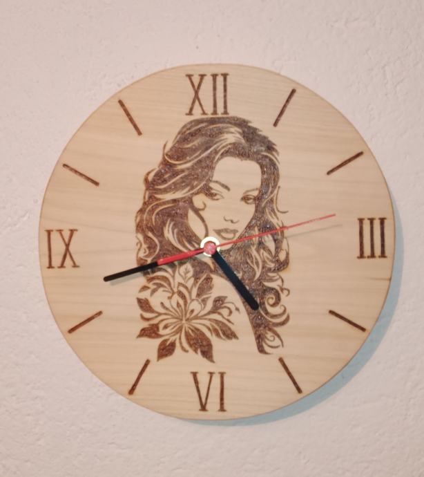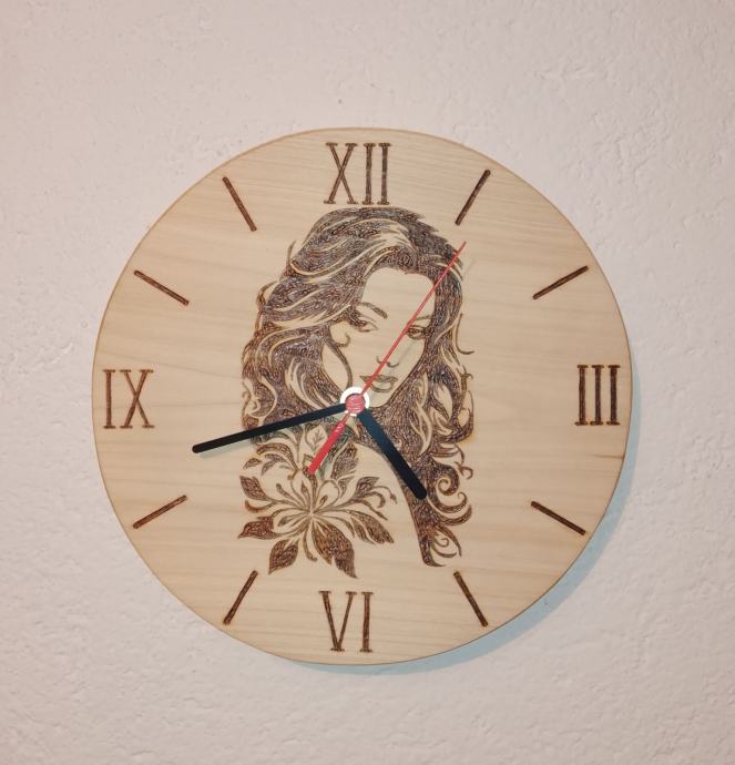 Drveni zidni sat od ariša, pirografija, ručni rad. Mogućnost crtanja slike po narudžbi.