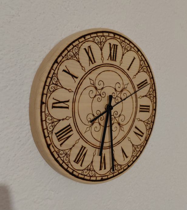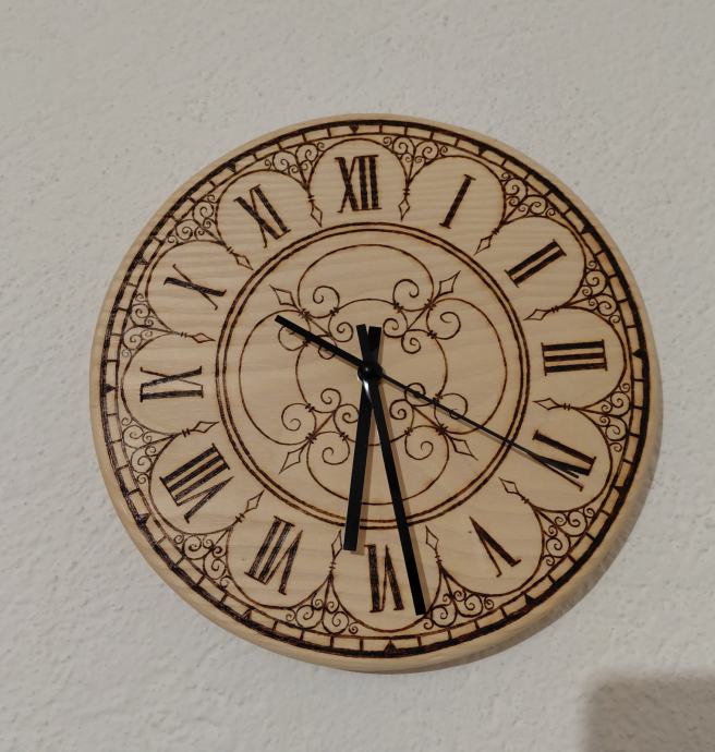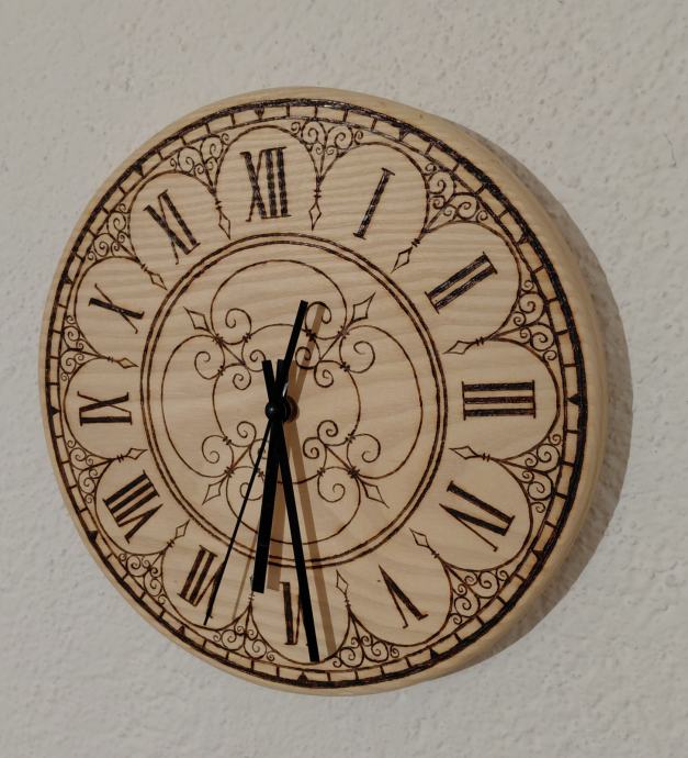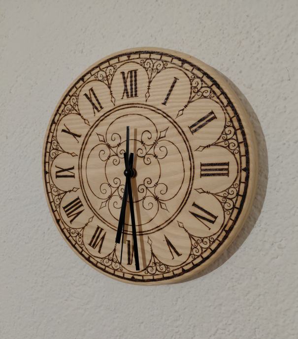 Drveni sat od jasena, pirografija, ručni rad.