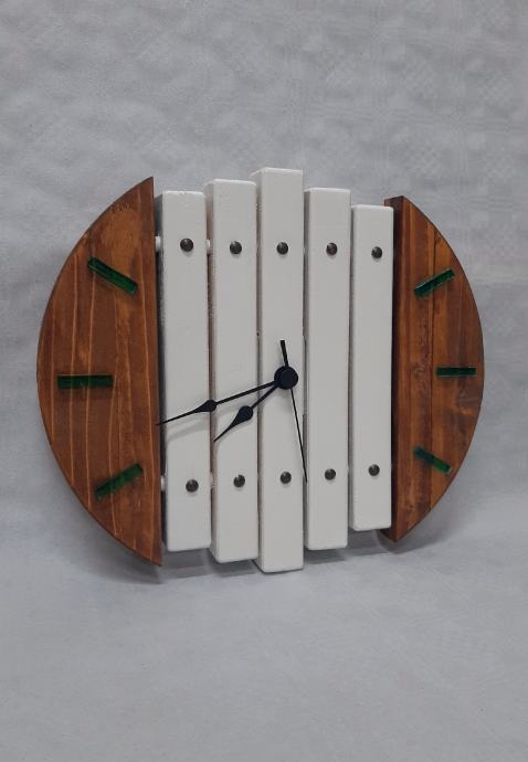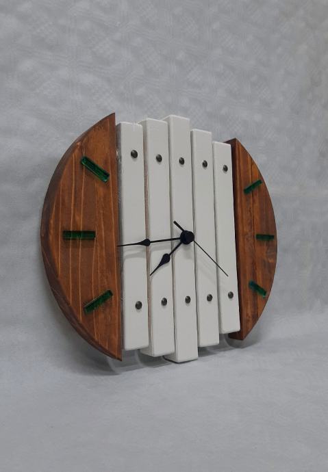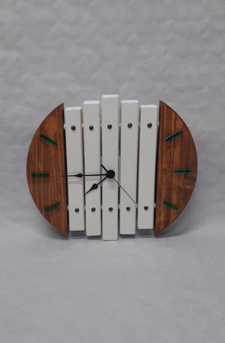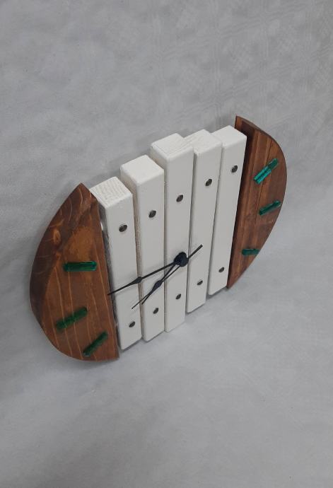 Neobičan drveni sat,kombinacija drva i jednostavne bijele boje sa kazaljkama od epoxy smole u neobično tirkiznoj boji.
