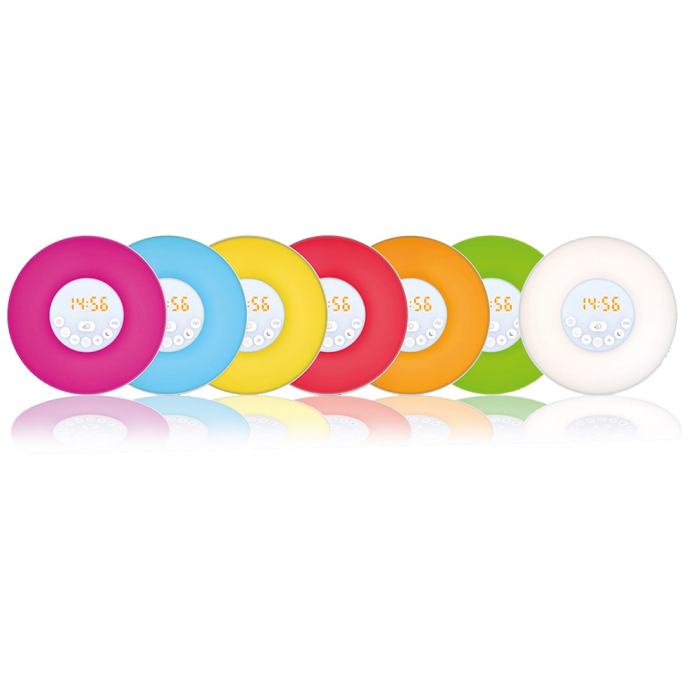 Sat vas budi blagim zvučnim i svjetlosnim efektom, simulirajući izlazak sunca koja započinje 30 minuta prije alarma. Također vam pomaže da zaspite s 30-minutnim efektom zalaska sunca. Zvukove alarma možete odabrati po želji i ponavljati ih svakih 5 minuta pomoću funkcije odgode. Zvukovi alarma: zvukovi prirode (ocean, ), poznate melodije (klavir, violina), radio ili bip-bip. Zaslon sa amber osvjetljenjem koji se može isključiti, s podesivom svjetlinom, 12 / 24 satni prikaz, prikaz frekvencije i pohrane, noćna svjetlost, topo bijela boja s podesivom svjetlinom, ručna ili automatska promjena RGB LED svjetla, automatska pretraga i spremanje FM radio postaja, dodirne tipke na prednjoj ploči, napajanje USB adapter s microUSB kablom (~ 1,2m), u slučaju nestanka struje, memorija se može osigurati s 3 x AAA (1,5V) baterijama ( nisu uključene u pakiranje ), dimenzije 170 x 165 x 130 mm