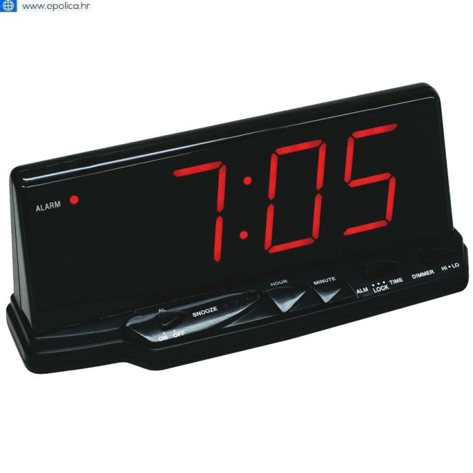 Digitalni sat sa alarmom, LED zaslon 1,8" sa podesivim osvjetljenjem, 24 satni format prikaza vremena, alarm tone, Snooze funkcija ( do 8 minuta ), plastično kučište, baterija (6LR61) za memoriju sata, napajanje 230 VAC / 50Hz / 3W