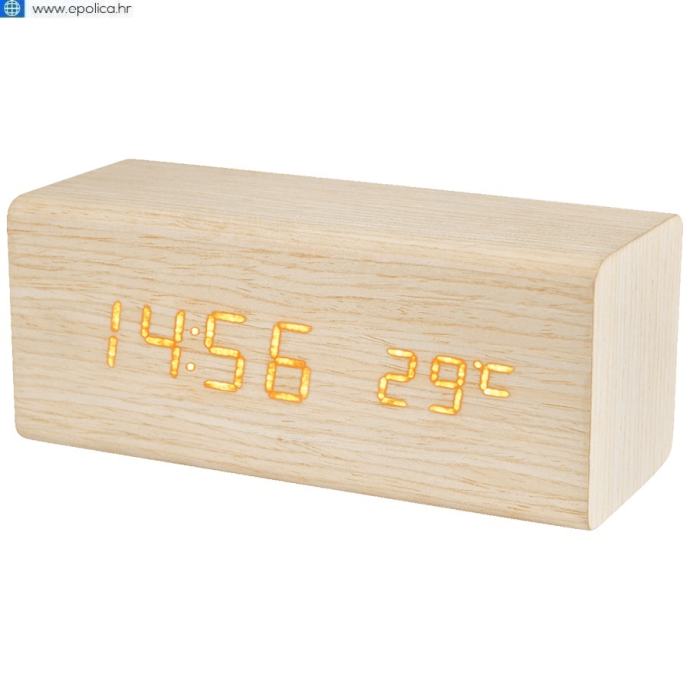 Sat sa alarmom i termometrom, drveno kućište. Digitalni sat sa alarmom, atraktivan dizajn, materijal izrade kućišta drvo, amber žuti LED display sa prikazom sat / datum / temperatura, 12/24 format vremena, temperatura od 0 .....50°C, alarm " beep", interval 1 min, 3 alarmska vremena istovremeno, LED display je moguće ugasiti, aktivacija LED display-a u OFF modu na dodir, alarmom, pljeskanjem rukama. Napajanje microUSB kabel (u pakiranju), CR2032 baterija za memoriju sat/datum, dimenzije 156 x 65 x 65 mm, težina 250 g