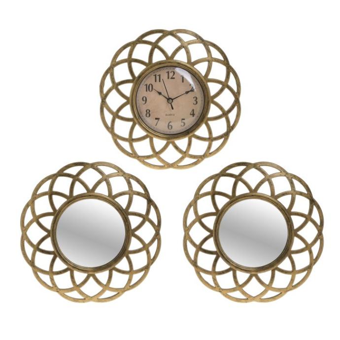 Set u kojem dolaze zidni sat sa zlatnim okvirom te dva ogledalca koja ga savršeno nadopunjuju.