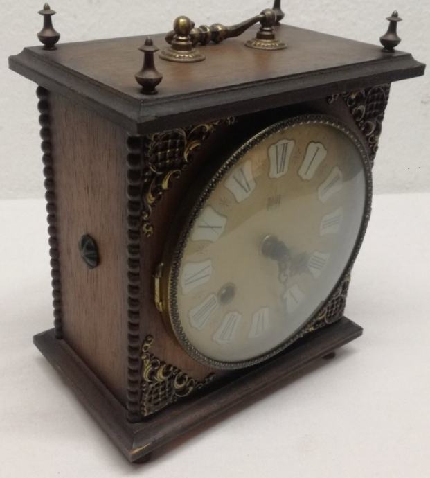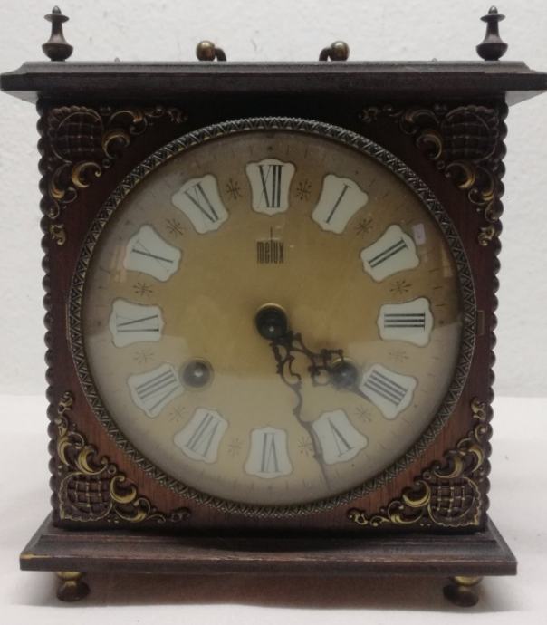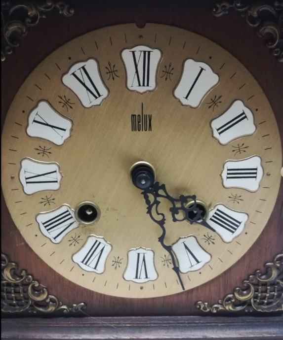 Prodajem stolni sat MELUX iz 1970g od mesinga drvo kesten. Prekrasan stolni sat s uzdignutih rimskih brojeva. Zvoni ugodnim udarcima na pola i svaki sat točan broj sati. Mogućnost isključenja zvuka melodije. Funkcionalan je i kompletan s originalnim ključem za navijanje, znači mehanički s 8 dnevni mehanizam, dolazi iz Njemačke u super očuvanom stanju s malim znakovima starenja. Visina mu je 21cm širina 17cm, a dubina 10cm.Težina 1.2kg.Dostava za Zagreb i Zagrebačku županiju besplatna a za ostatak hrvatske dostava HP isto besplatna.