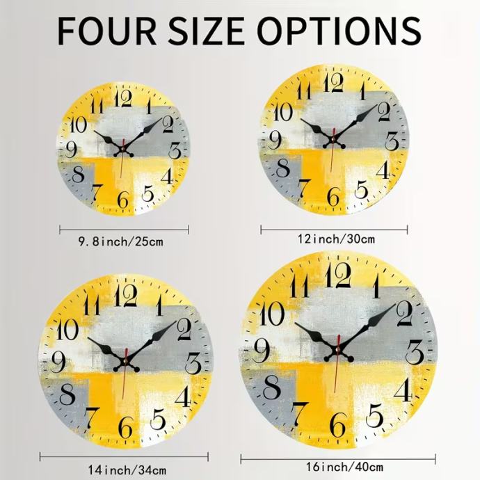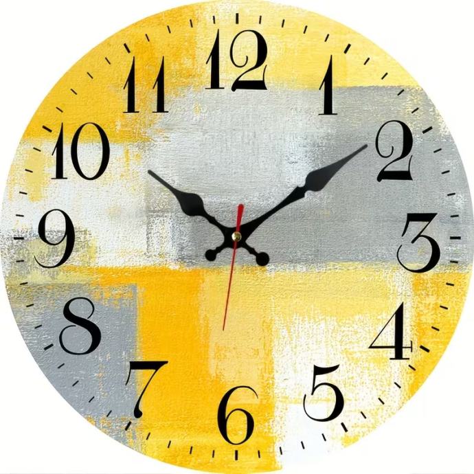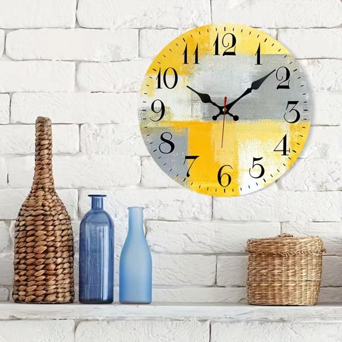 Tihi žuto-sivi apstraktni zidni sat - drveni, ne otkucava, na baterije