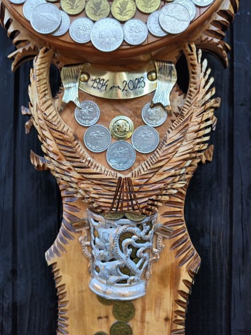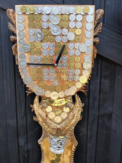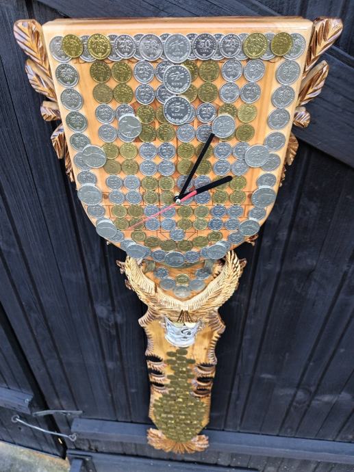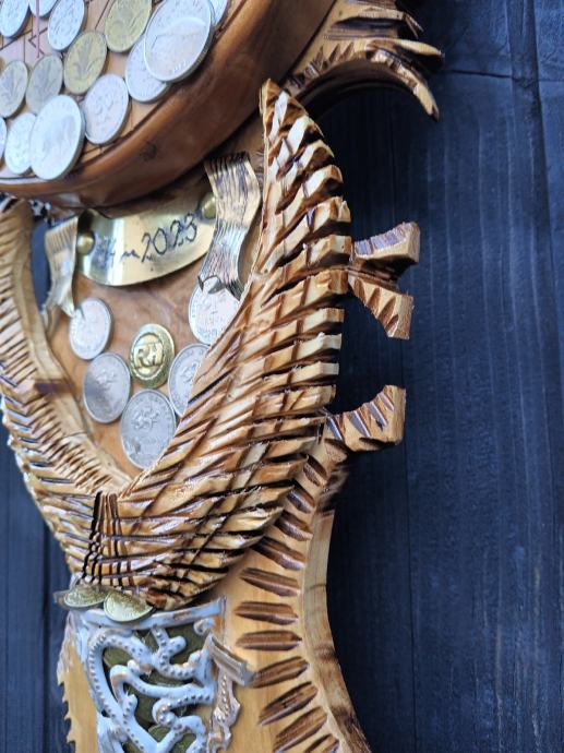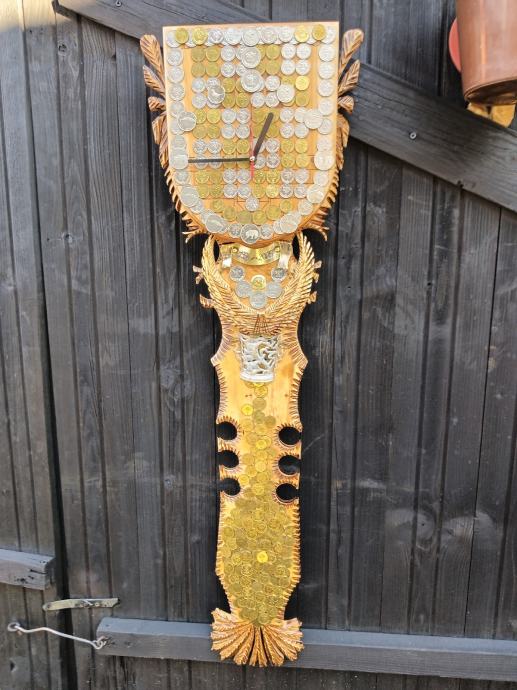 Ručno napravljen masivni veliki zidni sat,od punog drveta sa Kunama i Lipama i svim detaljima ručne izrade,duborez,graviranje,krila,plašt sa datumom, pehar,lakiranje bezbojnim lakom za parkete u tri sloja - UNIKAT. DIMENZIJE: širina 30.cm x dužina 100.cm x debljina drva- 5.cm. težina zidnog sata je 3.kg. Radi se o unikatnom masivnom satu sa kvalitetnim satnim mehanizmom.