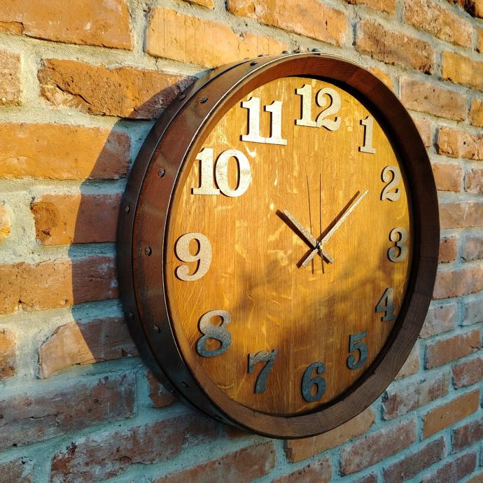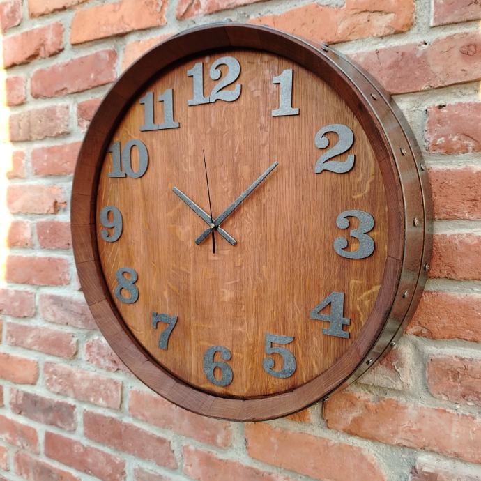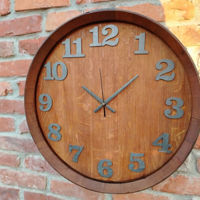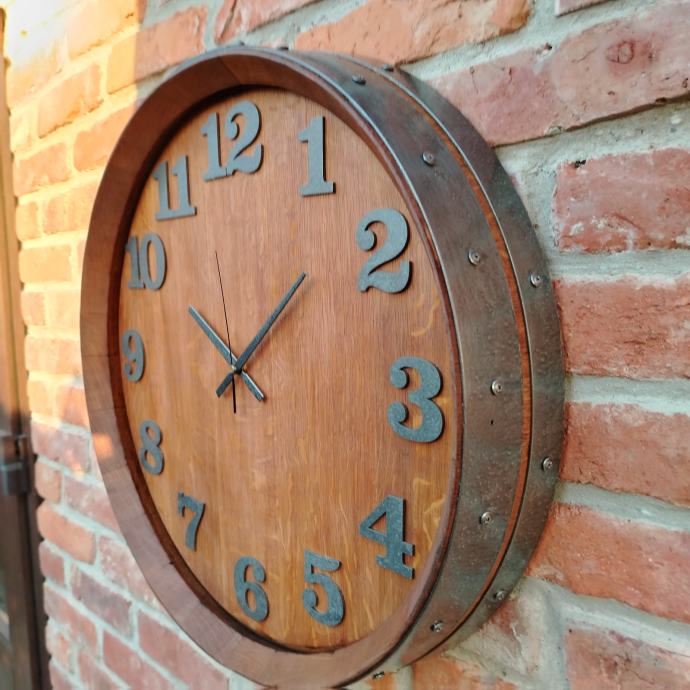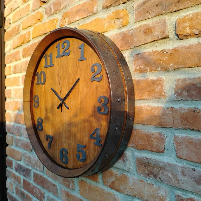 Zidni sat izraden od hrastove bačve promjera 60 cm .
