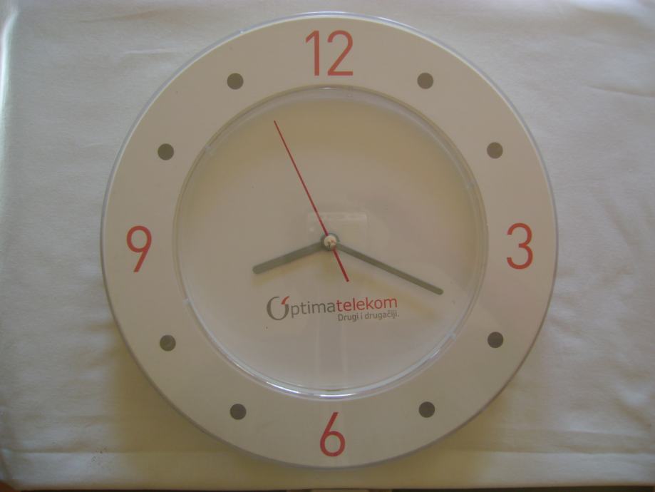 Zidni sat Optima - promjer 29 cm, ispravan, vrlo dobro do odlično očuvan, sa manjim tragovima korištenja, ali bez oštećenja, stanje je vidljivo na slici.