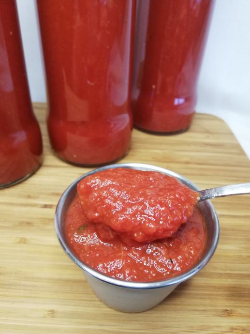 Domaći gusti umak od eko rajčice, napravljen uz dodatak soli i bosiljka. Rajčica je iz vlastitog vrta, nešpricana i domaća. Nije dodan šećer, samo malo soli i domaćeg bosiljka. Rajčica je pasirana i kuha se dok umak ne postane fin i gust. Odličan kao umak za pizzu, nije ga potrebno prokuhavati, može se i razrijediti za juhu od rajčice. U boci od 720 ml, pasteriziran. Može stajati na sobnoj temperaturi do 2 godine na tamnom. Na slici se vidi gustoća, nije rijedak i vodenast kao što znaju prodavati. Okus koji vraća u djetinjstvo, bez aditiva i pojačivača okusa!