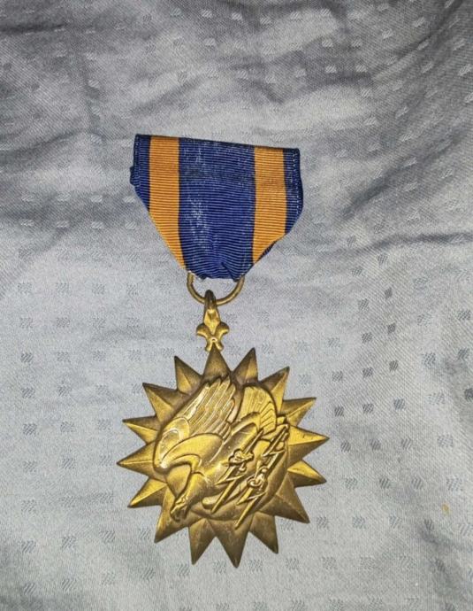 Prikazani predmet je Zračna medalja, vojno odlikovanje Oružanih snaga Sjedinjenih Američkih Država. Namjena: Ustanovljena 11. svibnja 1942., dodjeljuje se za pojedinačna herojska djela ili zaslužnu službu u zračnim borbama. Dizajn: Medalja je izrađena od bronce u obliku šesnaestokrake lepeze (ruže kompasa). Na licu je orao koji se spušta (napada) i u svakoj kandži drži munju. Vrpca je tamnoplava s okomitom zlatnom prugom duž svakog ruba. Medalja je obješena o vrpcu dizajnom ljiljana, koji predstavlja visoke ideale američkih pilota. Nagrada: Postignuće potrebno za ovu medalju niže je od onog potrebnog za Križ za istaknuto letenje, ali se i dalje mora postići s odlikovanjem koje nadilazi ono što se obično očekuje.