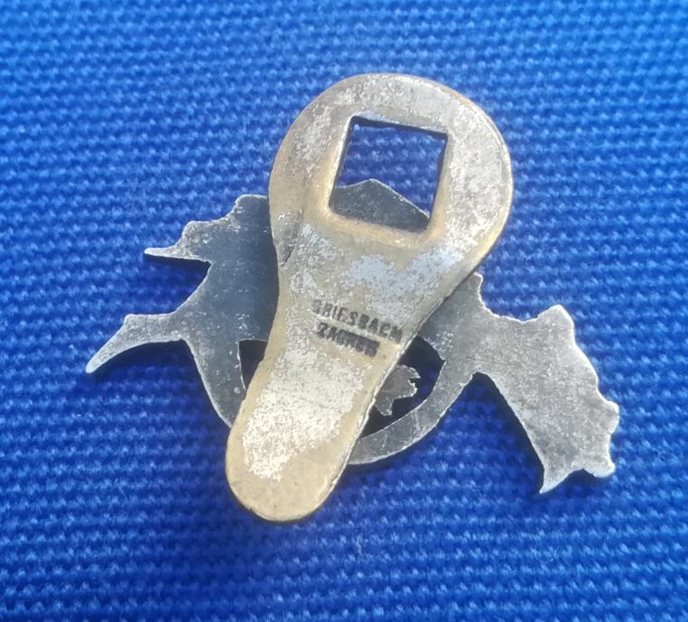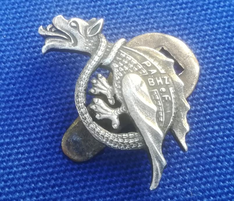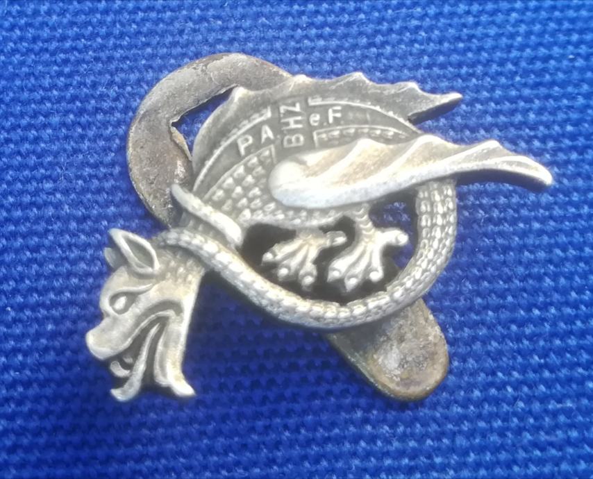Značka na papučicu družbe "Bratstvo Hrvatskog zmaja" ; srebrna značka kovnice Griesbach Zagreb iz 1930ih ; u izvornom vrlo dobrom stanju kako je vidljivo na fotografijama.