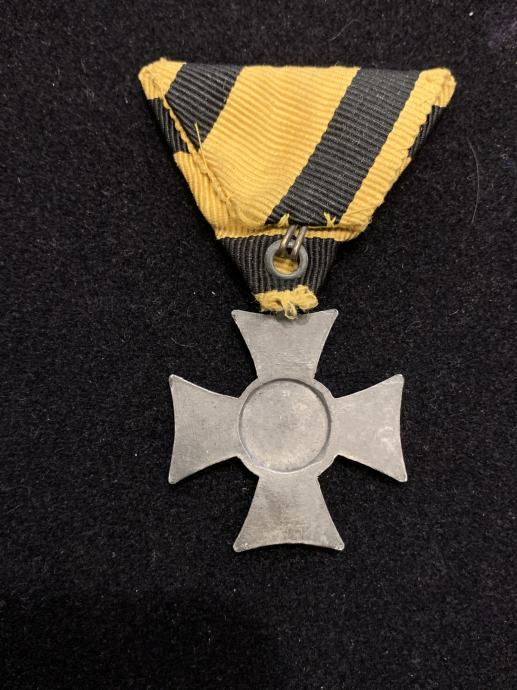 Austrougarski "KRIZ ZA VOJNU DOČASNIČKU SLUŽBU OD VI. GODINA u Austrougarskoj vojsci, peti model model iz perioda 1918. do 1919.godine. Ovo je rijetka varijanta križa sa kraja I. svjetskog rata izrađena od kositra - cina zbog nedostatka bakra, bronce i mesinga.