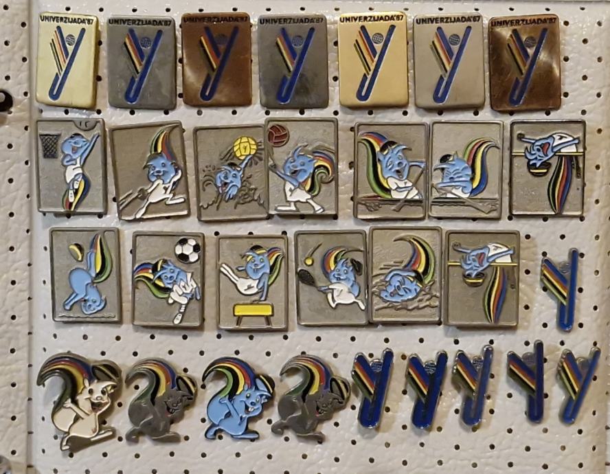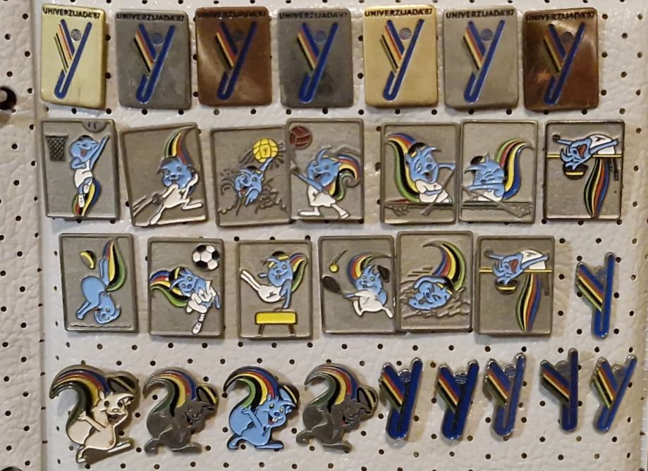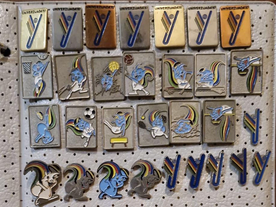 Lot od 30 značaka koja prikazuje kolekciju značaka s Univerzijade '87 održane u Zagrebu (komplet također sadrži svih 12 različitih sportskih disciplina kroz maskotu "ZAGI").