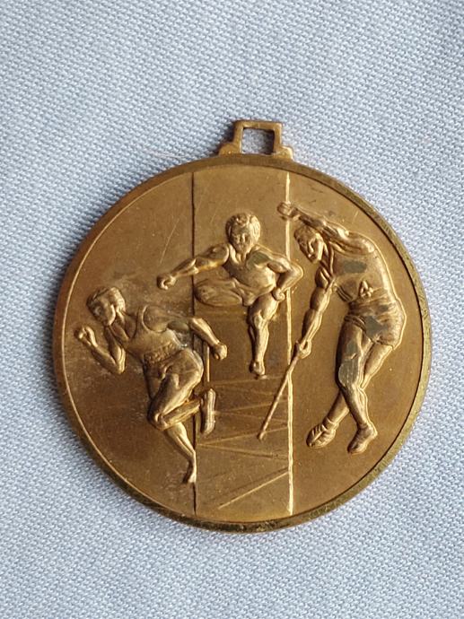 MEDALJA. Tri sportaša. Bakar boje. Rub zlatne boje. Mob