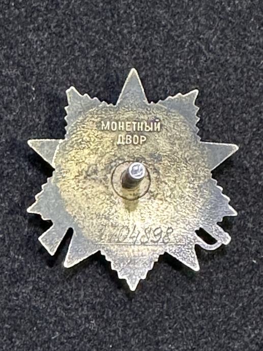 Orden Domovinskog rata II. stupnja, iz vremena SSSR-a. Orden na poleđini ima ugraviran broj 1704898 i istisnuti naziv proizvođača "MONETNIJI DVOR". Orden je izrađen od posrebrenog tombaka i ukrašenog sa crvenim i bijelim emajlom. Dimenzije ordena su: visina = 46,10 mm; širina = 43,88 mm a težina je 39,32 grama. (Model ponude je 1).