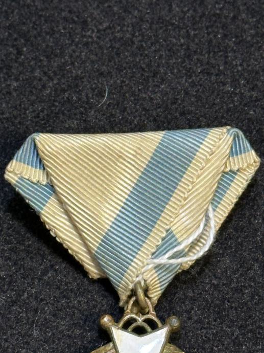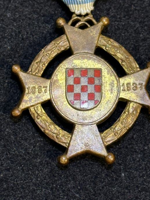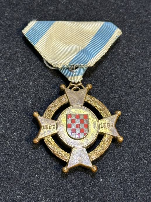 SPOMEN KRIŽ HRVATSKOG DRUŠVA BAN JOSIP JELAČIĆ IZ ZAGREBA, ustanovljen je 1937. godine povodom pedeseto godišnjice Društva (1887-1937.). Spomen križje izrađen od pozlaćene bronce i ukrašen je bijelim i crvenim emajlom. Dimenzije križa su: 48,5 x 43 mm. Na bijelom emajlu vidljiva su blaga oštećenja. Vrpca je od moarirane svile i iz vremena je. Na reversu je istaknuta signatura "GK", kovnice Griesbach i Knaus iz Zagreba,
