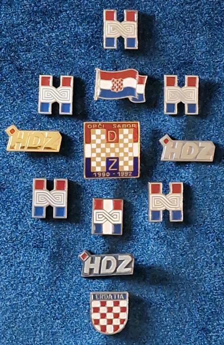 Lot odlično sačuvanih 12 značaka političke stranke HDZ-a od kojih je jedna napravljena povodom održavanja Općeg Sabora HDZ-a u razdoblju 1990-1992. godine.