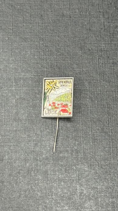 vintage kolekcionarska značka s prikazom planine Raduha u Sloveniji, visoke 2062 metra, i sela Luče. Tema: Planina Raduha i grad Luče, Slovenija. Nadmorska visina planine: 2062 metra. Istaknuti cvijet: Runolist, poznati alpski cvijet.