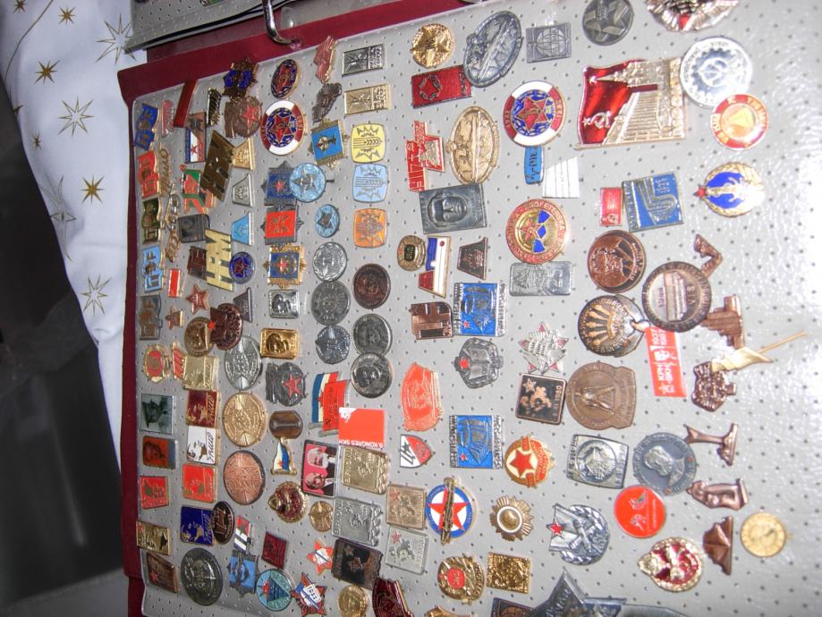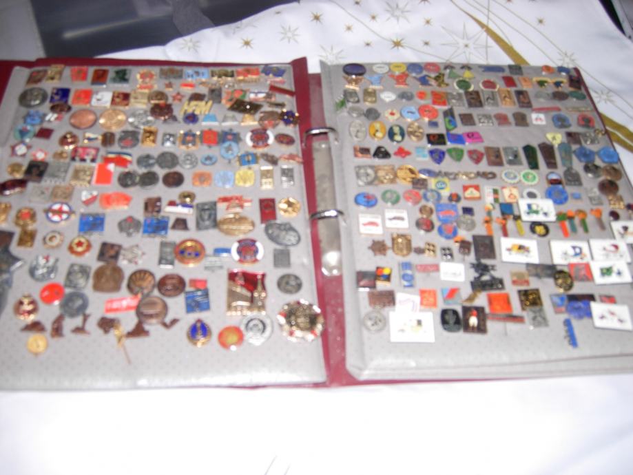 znacke starosti izmedu 30-40 godina,vojne,lovacke,sportske i ostale...600 komada.....ima vrijednih kolekcija