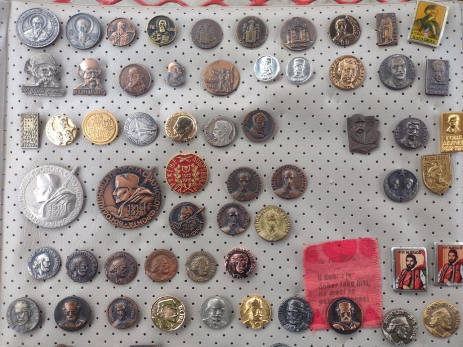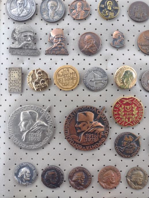 Veliki lot različitih značaka s tematikom srpskih povijesnih ličnosti, povijesnih događaja, srpskih gradova i znamenitosti, zatim crkava i manastira.