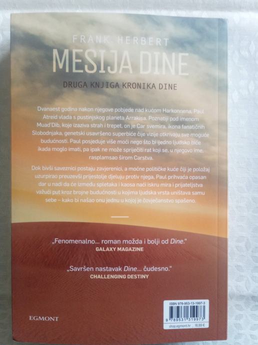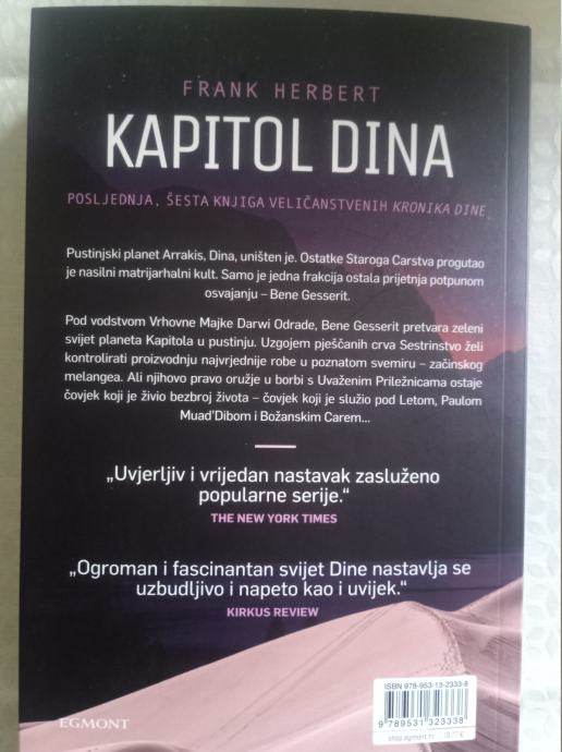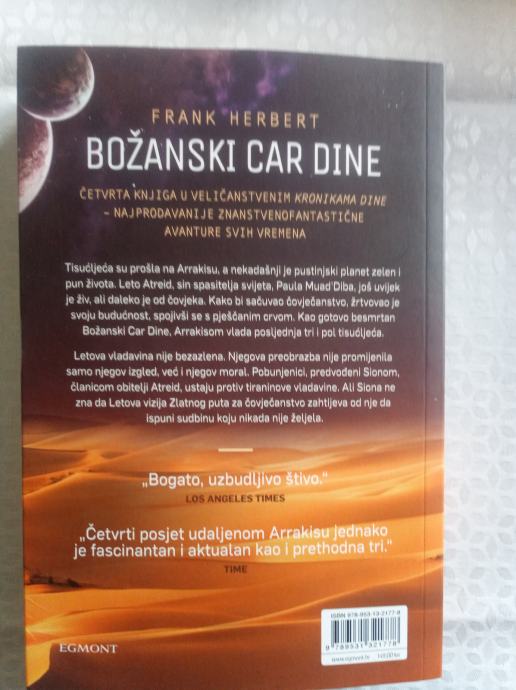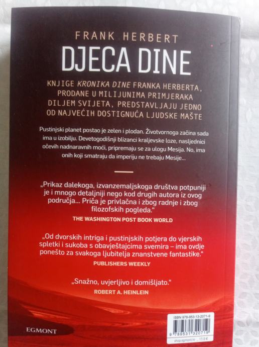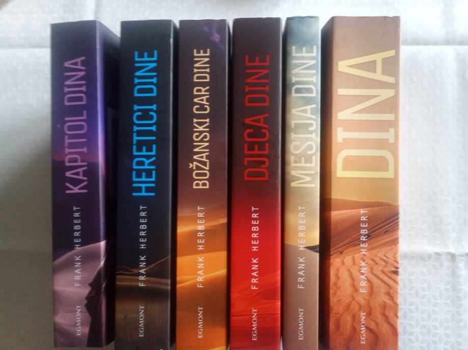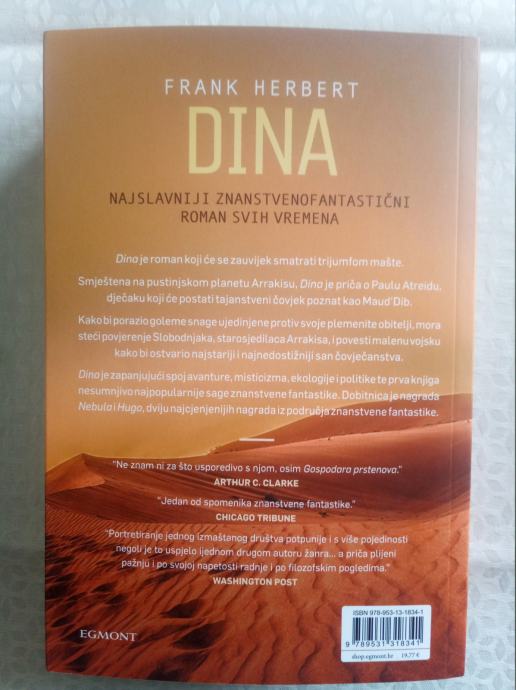 Dina je prva knjiga najslavnije sage znanstvene fantastike, skok u jedan živopisno izmaštani svijet vrlo dalekih tisućljeća. Dina, zajedno s nastavcima, zasigurno najveći SF ep svih vremena, kozmička epopeja o dobru i zlu, puna pustolovina, izdaja, misticizma, ekologije i političkih intriga, od feudalnog društva iz daleke budućnosti do ideje o uzgoju čovjeka nadnaravnih, gotovo božanskih moći. Dina je Franku Herbertu donijela nagrade Nebula i Hugo. Nakon Dine objavljivani su, sve do autorove smrti 1986. njeni nastavci „Mesija Dine“, „Djeca Dine“, „Bog vladar Dine“, „Heretici Dine“ i „Kuća Dine“, sve čudesna djela koja obuhvaćaju tisuće godina i generacije junaka s kojima je autorova mašta dalje plela bogatu tapiseriju galaktičkog carstva, jednako zanimljivu po svojoj uzbudljivoj radnji koliko po misaonim varijacijama.