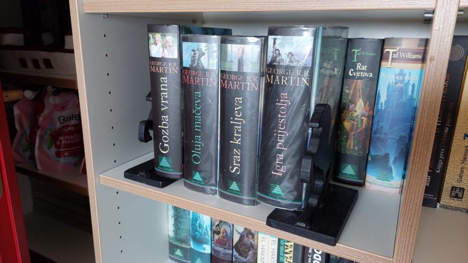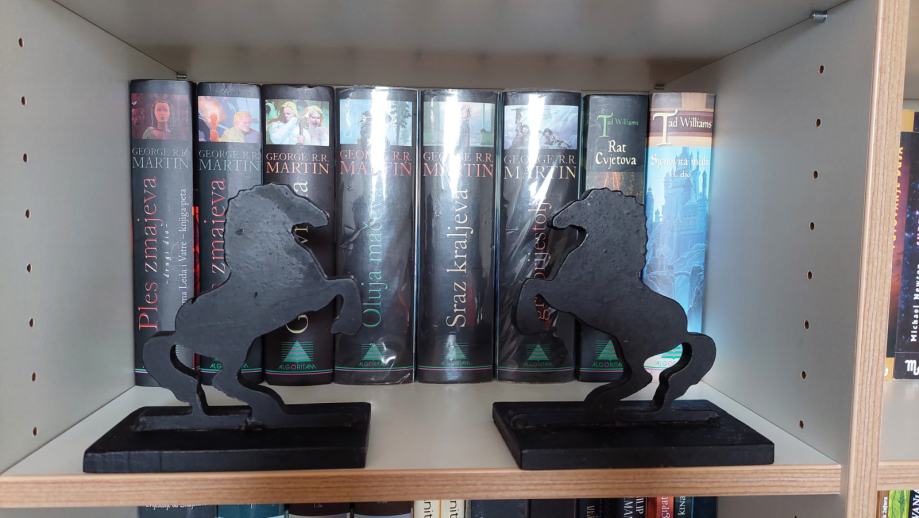 Uz knjige na poklon se dobivaju dva crna željezna držaća za knjige u obliku konja.