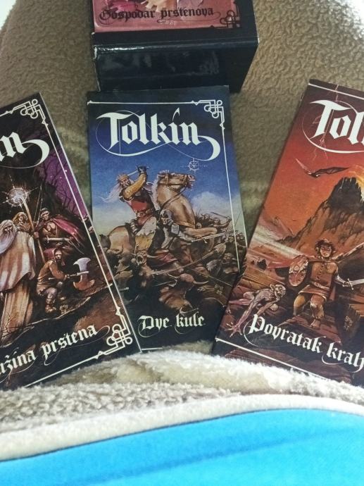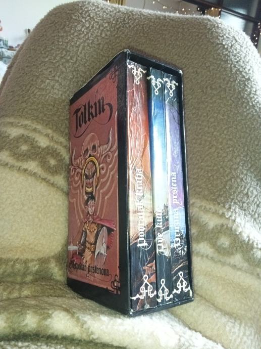 Izdanje Gospodara prstenova s kraja osamsedetih. Sadrži tri knjige. Srpski jezik. Prijevod Zoran Stanojević. Likovna oprema Dobrosav Bob Živković.