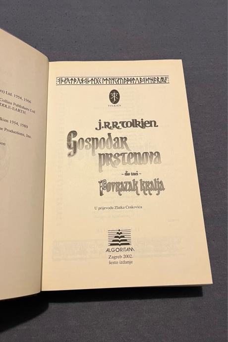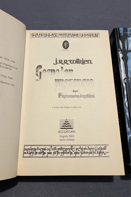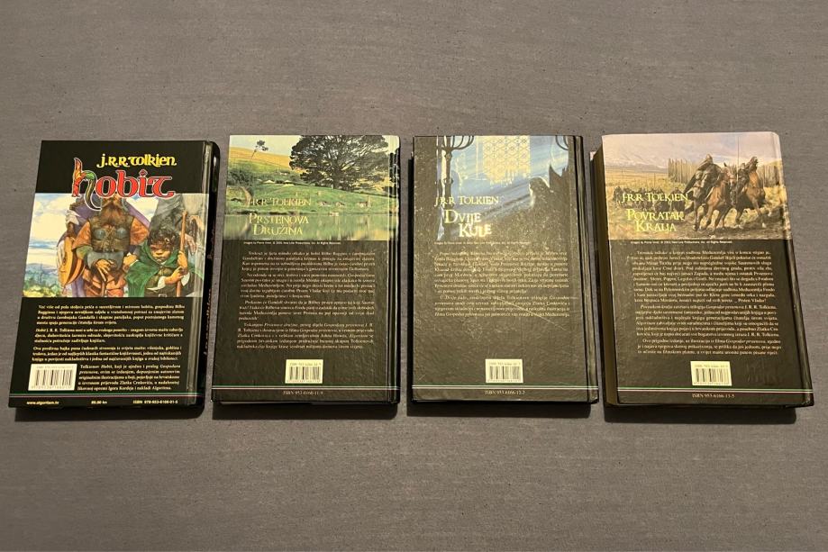 Prodajem komplet od četiri knjige J.R.R. Tolkiena na hrvatskom jeziku, izdanje naklade Algoritam. Komplet uključuje Hobita te sva tri dijela Gospodara prstenova s filmskim naslovnicama.