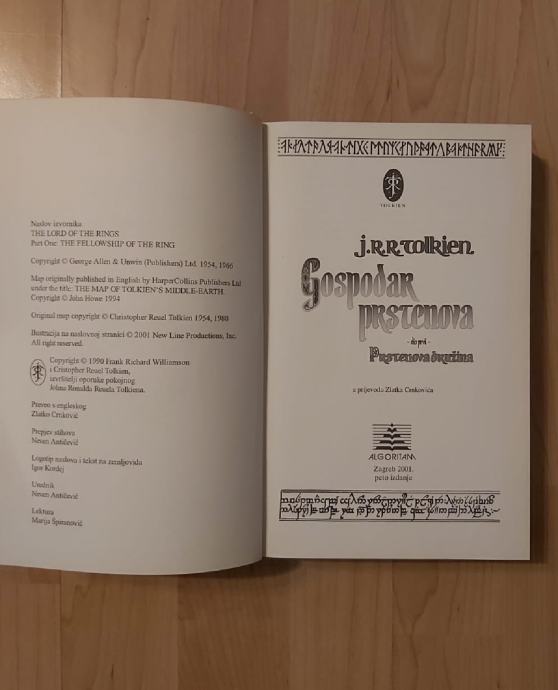 Gospodar prstenova: Prvi dio slavne Tolkienove trilogije o Međuzemlju i njegovim narodima Prstenova družina, Algoritam 2001 godina, 5. izdanje, tvrdi uvez.