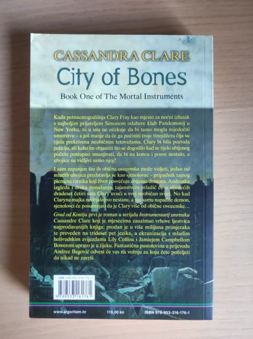 Sadržaj "Grad od Kostiju": Prva knjiga iz serijala "Instrumentarij smrtnika" čiji je glavni lik petnaestogodišnja Clary Fray. Ona pri jednom večernjem izlasku s prijateljem Simonom svjedoči umorstvu koji su počinila tri tinejdžera. Sljedeći dan kada stigne kući, shvati da joj je majka oteta, a nju ranjava demon. Nakon što je jedan od tinejdžera ubojica spasi od posljedica ranjavanja, objašnjava joj da oni nisu obični tinejdžeri, već sjenolovci, pripadnici tajnog plemena ratnika koji svoj život posvećuju ubijanju demona te da je možda i ona jedna od njih.