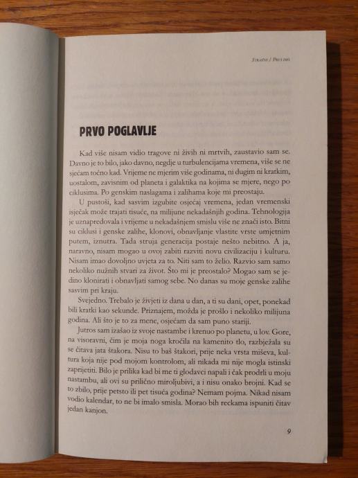Poznati hrvatski književnik debitira u žanru znanstvene fantastike i predstavlja posljednjeg dinosaura koji se skrivao milijun godina, preživljavao uz pomoć tehnoloških pomagala i instinkata, te se sad vraća na planetu Novih s kojima je njegova vrsta tradicionalno u ratu. Osim sudbinom čovječanstva i cijelih civilizacija, autor u prvi plan stavlja jednog dinosaura koji pati od depresije.