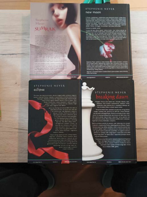 Prodajem knjige Sumrak saga isključivo u kompletu, cijena kompleta je 80€ fiksno plus poštarina, primam uplate na IBAN, revolut, keks pay, aircash, šaljem preko paketomata boxnow, preko tiska, preko paketomata Hrvatske pošte ili preporučenom poštom nakon vidljive uplate.