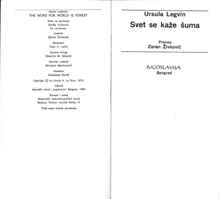 Ursula Legvin (LeGuin): Svet se kaže šuma, Jugoslavija, Beograd 1980.