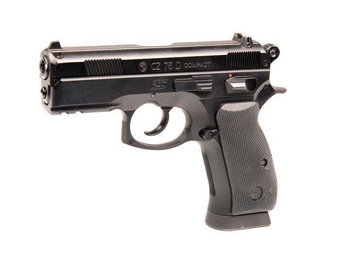 CZ-75 D Compact CO2 NBB (non-blowback) 4.5mm/0.177 BB zračni pištolj. (Zračni pištolj. Zračni revolver. Zračno oružje) S jedinstvenim serijskim brojem. Prednji kraj opremljen je šinom za montažu dodataka. Stražnji ciljnik je podesiv. Spremnik prima 17 kuglica i jednu 12g CO2 ampulu. Dno spremnika je gumirano, čime se umanjuje rizik oštećenja pri padu. Drška je također gumirana i orebrena, uz tzv. beavertail, što daje visok stupanj kontrole i ergonomije. Uz pištolj se isporučuje alat za izmjenu ampula i oslobađanje navoja na ustima cijevi, za montažu prigušivača.