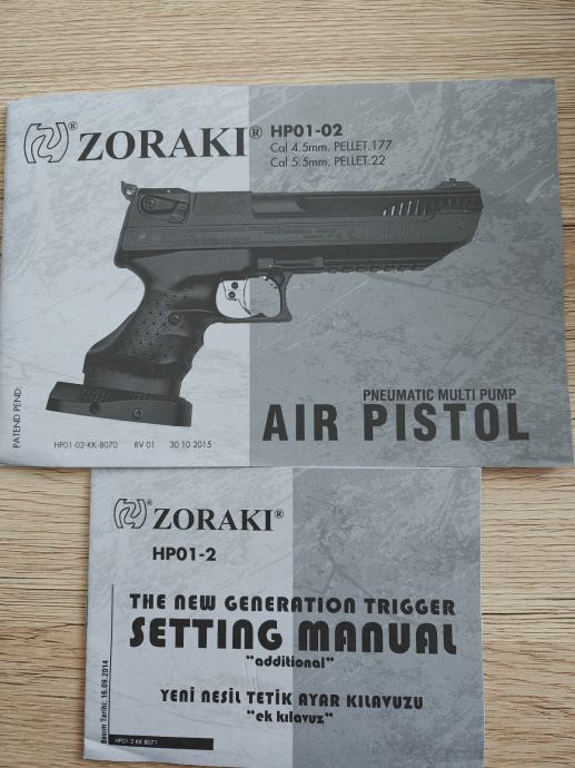 Prodajem novi zračni pištolj Zoraki HP01-02, pneumatski multi-pump model crne boje. Dostupan u kalibru 5,5 mm (.22 pellet). Radi se o sportskom pištolju s ergonomskom ručkom i podesivim nišanom. Uz pištolj dolazi i dodatni priručnik za podešavanje okidača (Setting Manual). Pištolj odličan za početnike i trening.