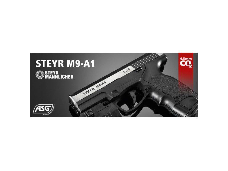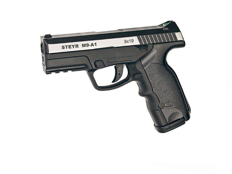Steyr-Mannlicher M9-A1 zračni pištolj NBB (non-blowback) Dual Tone 4.5mm/0.177 CO2. (Zračni pištolj. Zračni revolver. Zračno oružje) Ujedno je i jedan od najjačih zračnih pištolja. Ergonomska drška izvedena je pod nagibom od 111 stupnjeva a stražnji ciljnik opremljen je optičkim vlaknom. Šina omogućuje montažu lasera i svjetiljki. Spremnik je kapaciteta 19 kuglica, dok je 12-gramska CO2 ampula smještena u dršci pištolja i lako se mijenja.