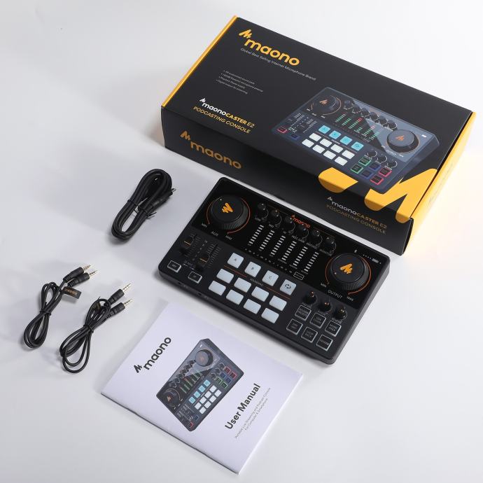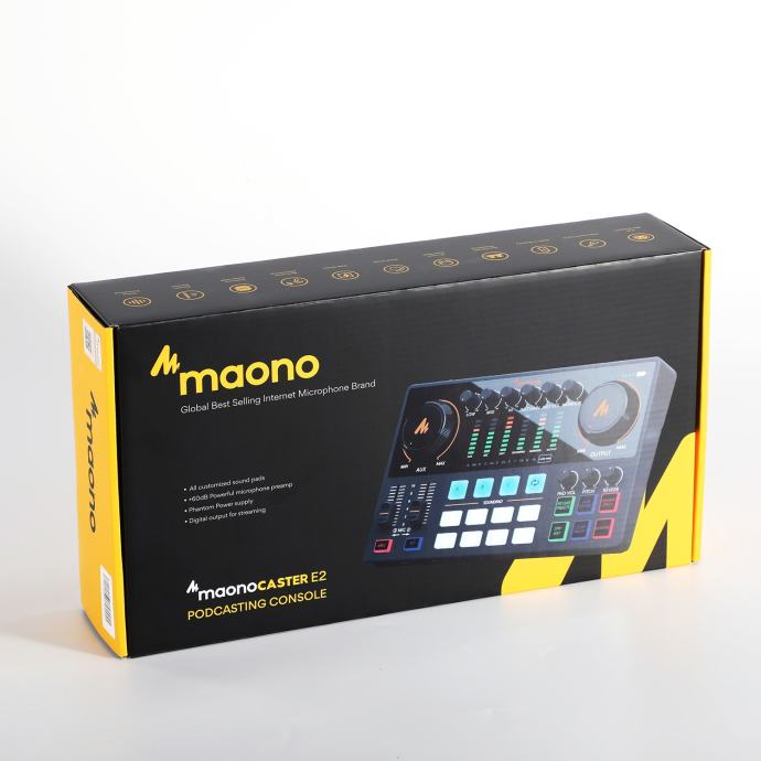 Maonocaster E2 posjeduje USB-C za povezivanje vašeg računala ili tableta, LIVE-OUTPUT 1/2 za povezivanje vašeg pametnog telefona za snimanje i streaming podcasta. Putem MONITOR SPK spojite studijski monitor za izlaz zvuka, koristite AUX-IN priključak za povezivanje pozadinske glazbe s pametnog telefona ili drugih uređaja, koristite MIC 1/2 i spojite svoj omiljeni XLR kondenzatorski/dinamički mikrofon.
