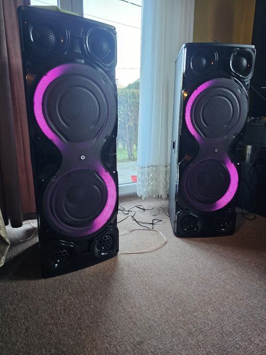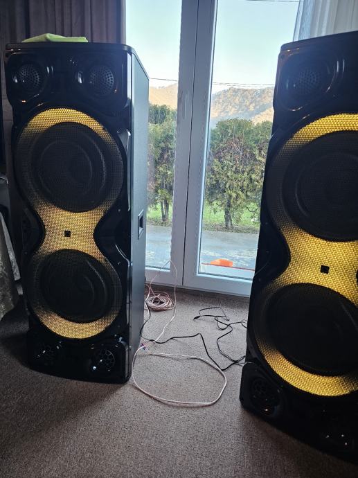 Zvučnici su velikih dimenzija s dvostrukim wooferima i tweeterom na vrhu, te LED osvjetljenjem u boji. Set je nov i potpuno funkcionalan.
