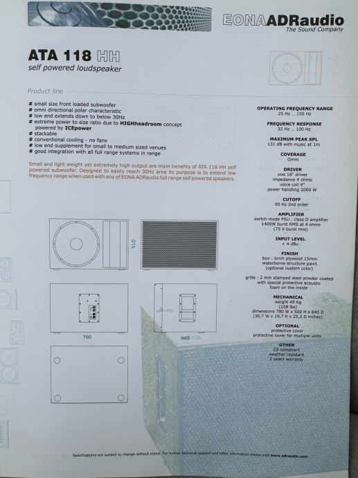 EONA ADRaudio ATA 118 HH - 18” aktivni subwoofer 2 komada. U 100% spravnom i očuvanom stanju. Moguća proba bez obveze na kupnju.