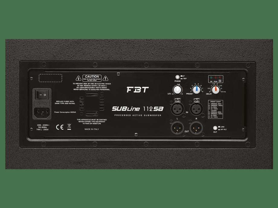 FBT Subline-112SA aktivni subwoofer. FBT SUBline 112SA je potpuno redizajniran sub sa bas-refleks konfiguracijom, ugrađen u brezovu šperploču i usmjeren je na proširenje niskofrekventnog odziva. Stvoreni s ciljem maksimiziranja omjera SPL/SIZE, imaju pojačala klase D, napajanje s prekidačem i digitalni procesor signala s unaprijed podešenim postavkama koje odgovaraju bilo kojem drugom FBT zvučniku. Uz IN/OUT stereo konektore, moguće je koristiti samo jedan subwoofer s lijevim i desnim zvučnicima. Ergonomske integrirane ručke za nošenje i ormarići od šperploče tour-grade omogućuju jednostavan transport