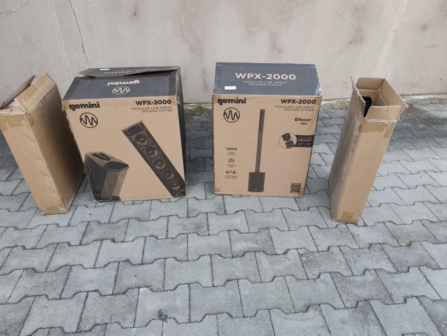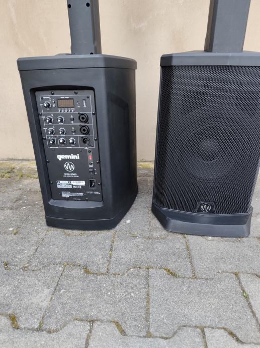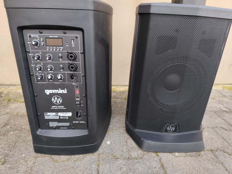 Gemini system mini line arraly WPX-2000 , stanje kao novo bez tragova korištenja, svaki stup ima 300w RMS, subwoofer 8" + 6x2.75" u satelitu, izuzetno malo i lagano a radi odlično, idealno za partye, klijeti, kafiće, OMB, ili duo. Ima i bluetooth na sebi, moguća proba, cijena za oba stupa 400€. (svaki stup plačen 326€)