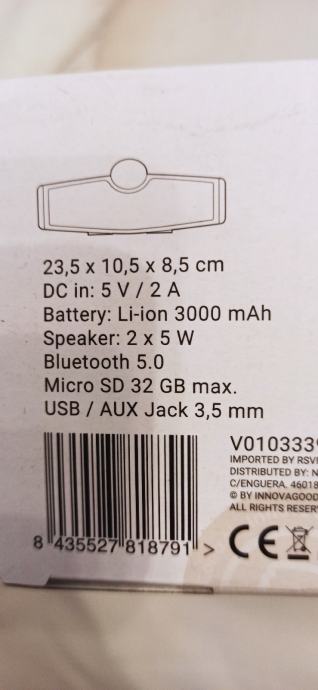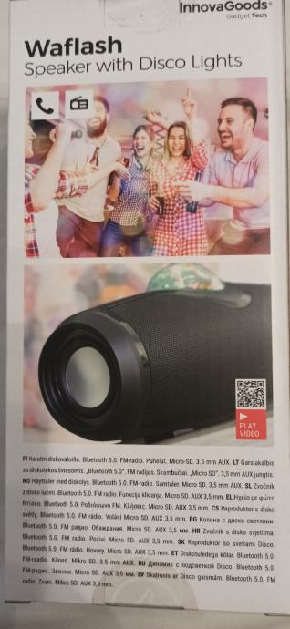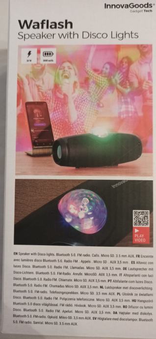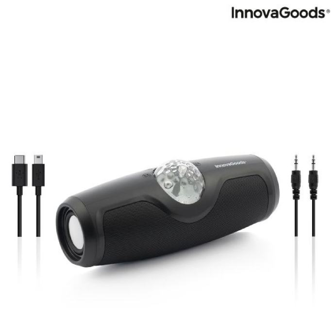 Originalni punjivi zvučnik s disko svjetlima savršen za stvaranje ugođaja na zabavama i proslavama uz najbolju glazbu i osvjetljenje za zabavu. Zbog svog laganog, bežičnog i prijenosnog dizajna, vrlo je ugodan i jednostavan za korištenje i prenošenje bilo gdje. Ovaj svestrani višenamjenski zvučnik ima rotirajuću mini loptu za 360° s višebojnim LED svjetlima i 2 načina osvjetljenja (fiksno ili trepereće u ritmu glazbe). Osim toga, ima Bluetooth 5.0 (domet ≤10 m), radio funkciju (FM), handsfree funkciju i ugrađeni mikrofon za javljanje na pozive. Može se povezati sa svim vrstama uređaja (pametni telefoni, iPad, MP3 player itd.), budući da omogućava reprodukciju zvuka s različitih ulaznih priključaka (USB priključak, Micro SD priključak 32 Gb maks. i 3,5 mm pomoćni ulaz). Uključuje jack kabel od 3,5 mm i USB > mikro USB kabel.