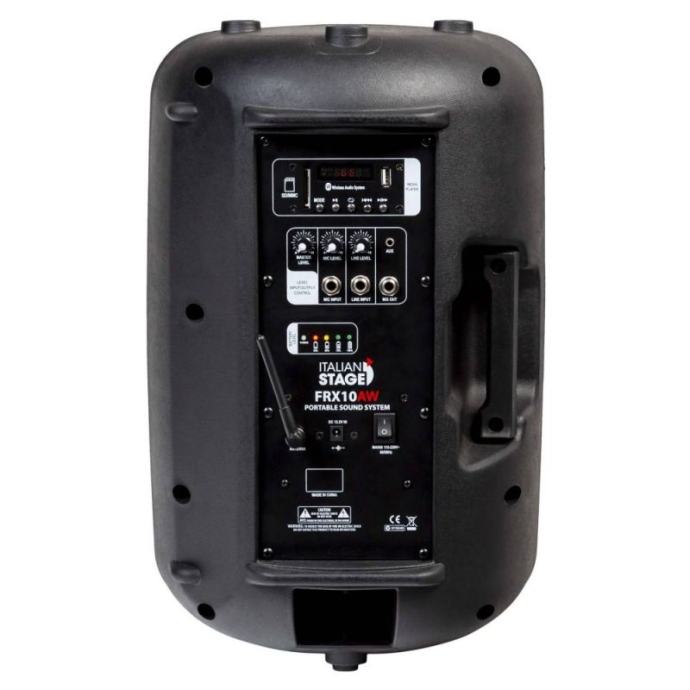 IS FRX10AW 10’’ Portable speaker with Battery, MP3 player, SD card, USB, bluetooth, IR Control. - 1 VHF Wireless Microphone. - Woofer 10’’. - Horn driver 1’’. - RMS Power 50W Class D Amplifier. - Peak power 100W. - Sensitivity 1W/1m 90dB. - Frequency response 40hz-18khz