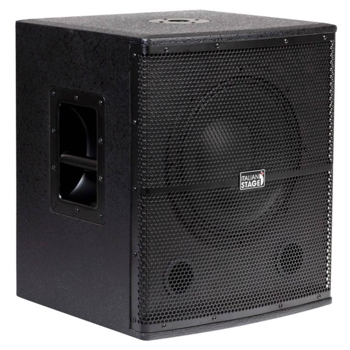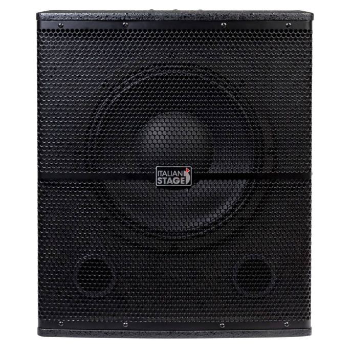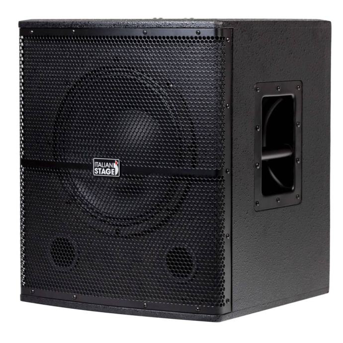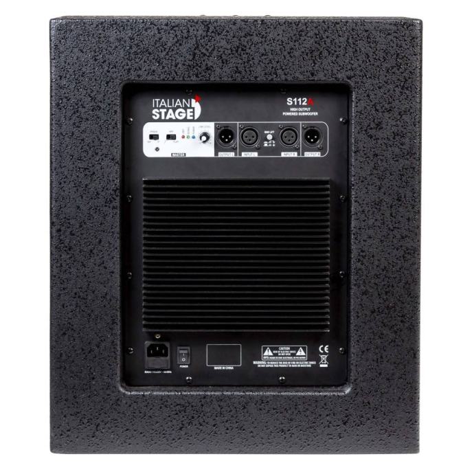 ITALIAN STAGE S 112 A Active Subwoofer - 12’’ wooden subwoofer. - 2 channels input & output. - Woofer 12”. - RMS Power 350W Class AB amplifier. - Peak power 700W. - Frequency Range 40hz-120hz. - Peak SPL 126 db. - Power Supply AC110V/AC230V