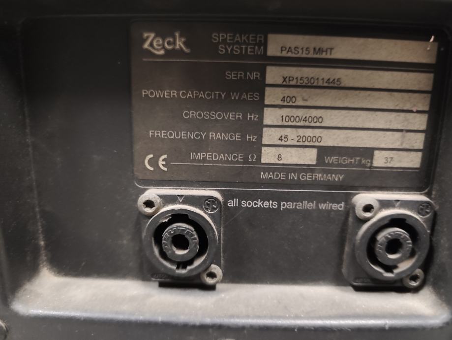 Zeck prazne kutije bez zvučnika. Imaju mreže, konektore, ručke, 3-way system 15" + 6.5" + tweeter. Mogu se lako prepravit po u bas binove za 15" ili 18" ili 2-way / 3-way po želji, prednja ploča 55*62cm