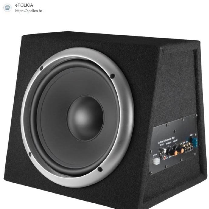 Subwoofer kutija, aktivna, 200W Subwoofer kutija za automobil, aktivna, pojačalo + zvučnik, zvučnik prečnika 250mm, snaga 150 / 200W, impedanca 4 Ohm, PP membrana, frekventni raspon 20 - (35) 200 Hz, podesiva skretnica 35 - 200Hz. Ugrađeno pojačalo isporučuje 100W snage. Robusna izrade, kutija odgovara svakom automobilu, daljinsko upravljanja ON/OFF, manualno podešenja zvuka, ulaz visokog signala- zvučnik, ulaz niskog signala RCA