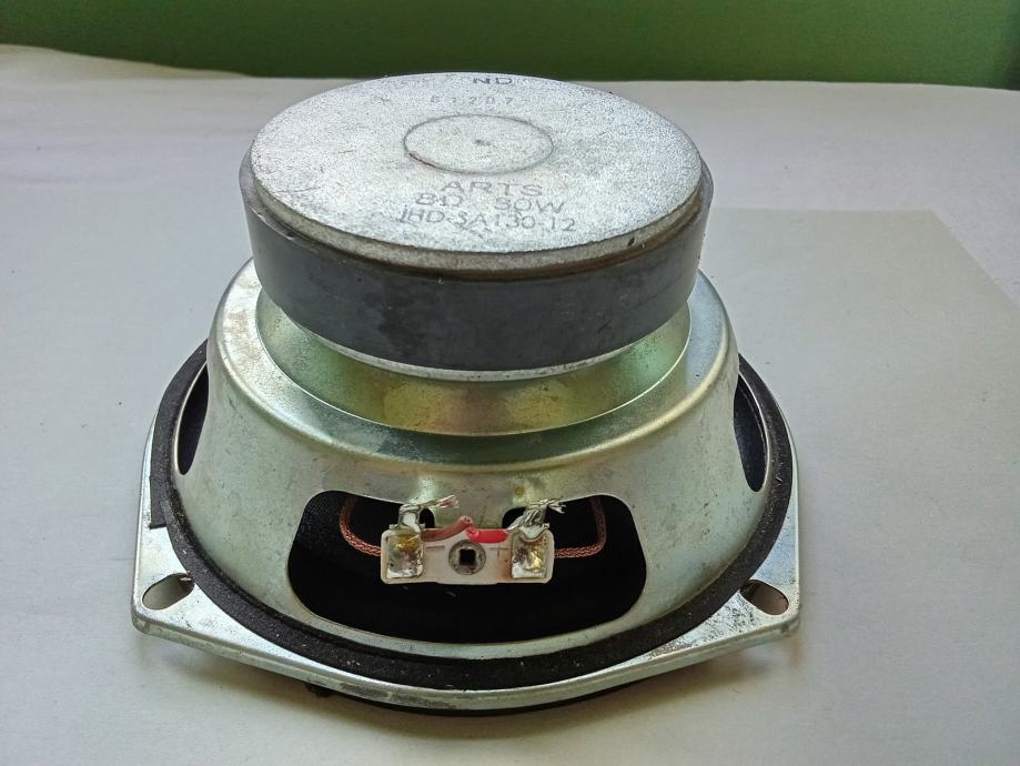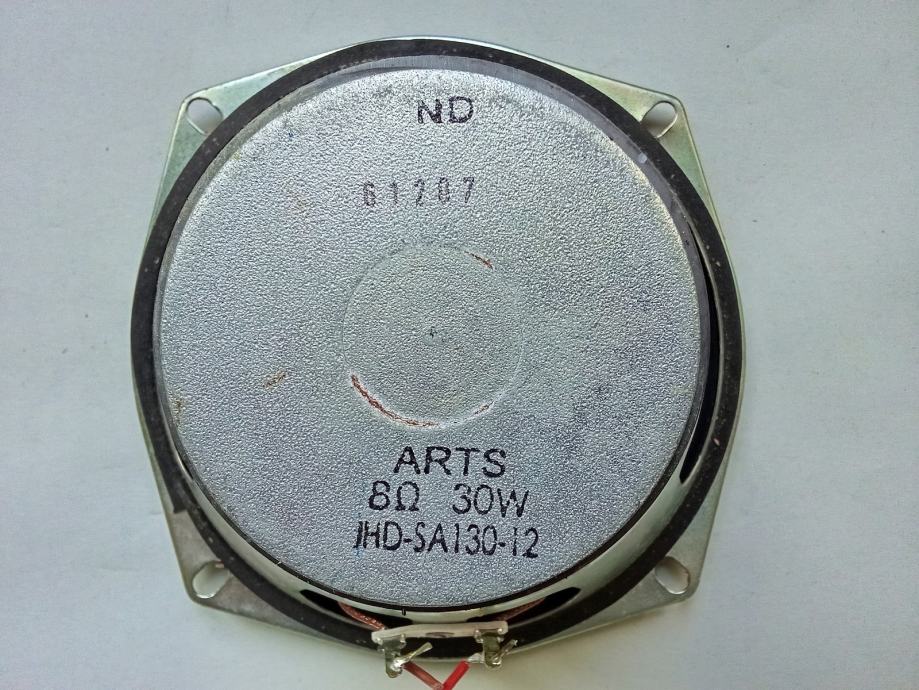 Prodajem samo jedan bas zvučnik Arts ND 61207 JHD-SA130-12, snage 30 W pri 8 Ohma. Vanjski promjer ovjesa je 120 mm, vanjski promjer obruča košare 135 mm, dubina ugradnje 58 mm, promjer magneta 80 mm, debljina magneta 15 mm, a promjer rupe na kutiji mora biti 125 mm ako se pričvršćuje na vanjsko lice kutije ili do 120 mm ako se pričvršćuje na njeno unutarnje lice. Masa predmeta je 680 g.